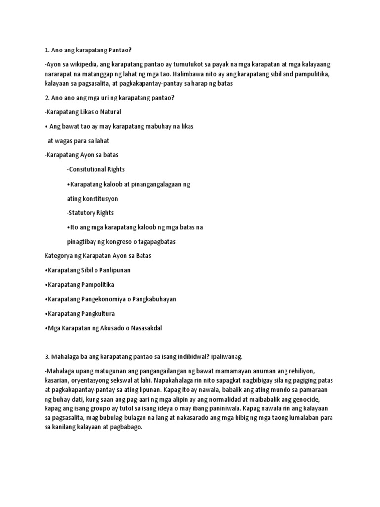 Mahalaga ba ang karapatang pantao. Sapalagay mo mahalaga ba ang karapatang pantao. Nagakakaroon ng pagkakapantay-pantay sa harap ng batas. A Mahalaga ba ang mga karapatan Ipaliwanag ang sagot b Paano mo ipamamalas ang from GRADE 10 at Leyte Normal University.