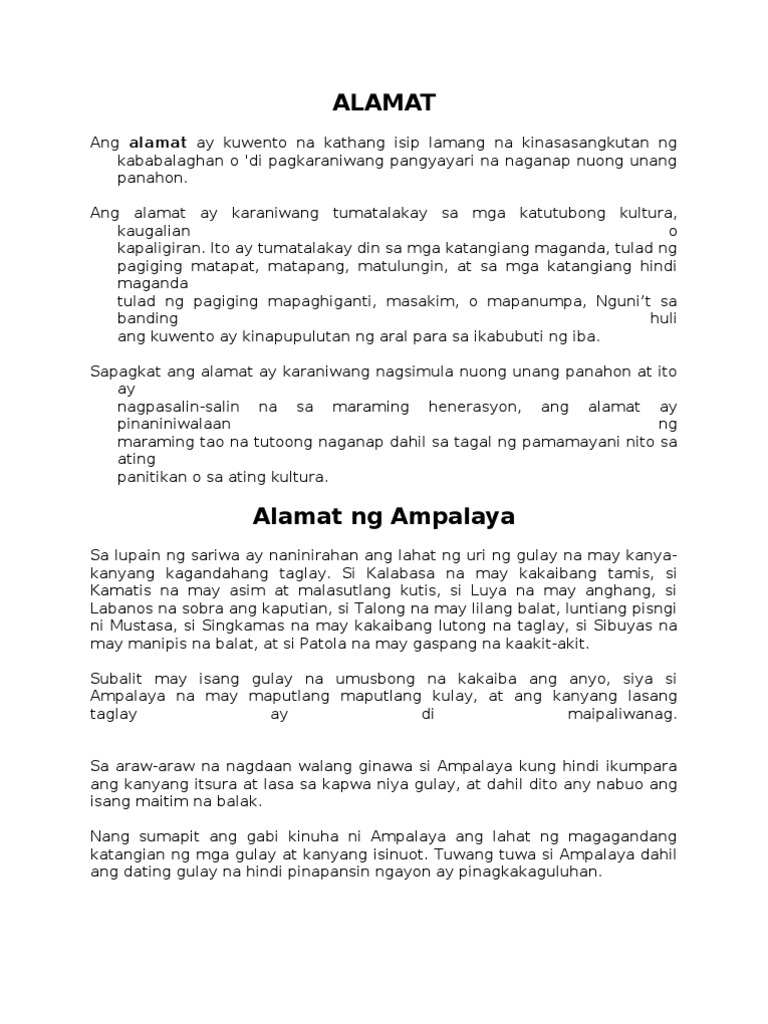 Mahalaga ba ang alamat. Ano ang ibinubunga nito sa pag-unlad ng wika. Ang mga silbi ng mga alamat na nanggagaling sa ating mga ninuno ay malalaman natin ang mga gintong aral na mahalaga para sa atin.